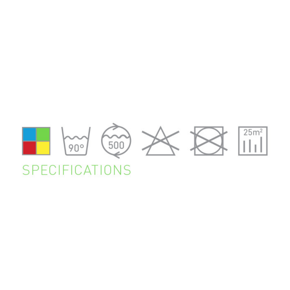 Πλένεται στους 90°C και έχει κύκλο ζωής τις 500 πλύσεις. Δεν χρησιμοποιείται με χλωρίνη και δεν μπαίνει στο στεγνωτήριο.