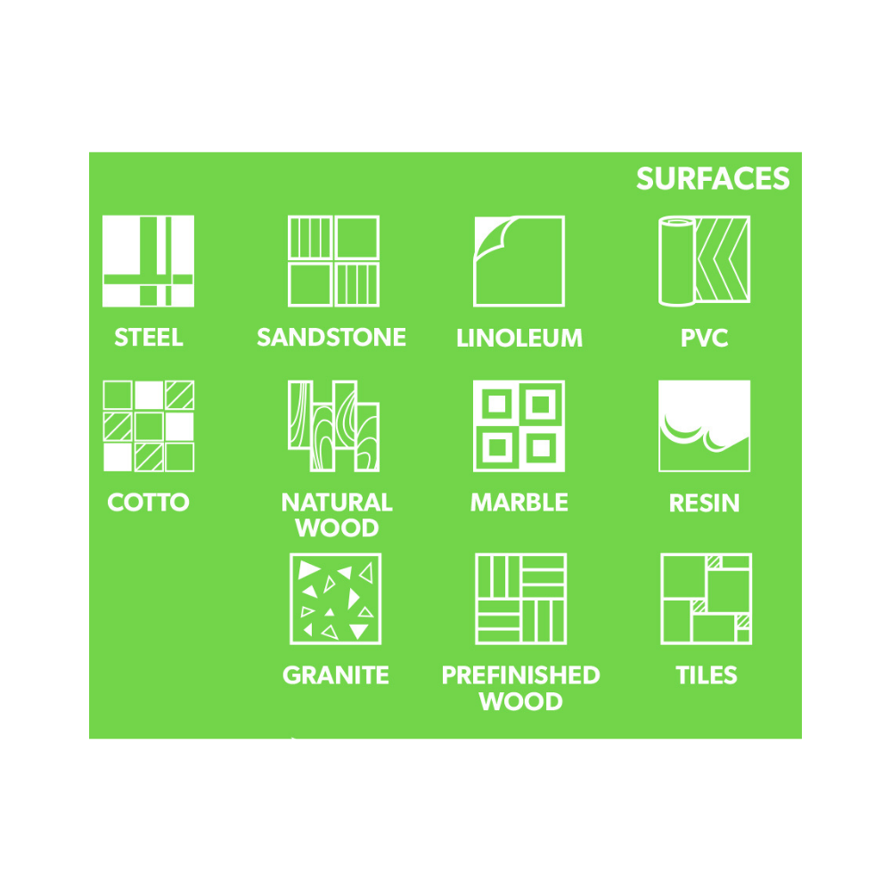 Ιδανική για επιφάνειες όπως: Αντιολισθητικό Πλακάκι, Γρανίτη,Μουσαμά, Μάρμαρο, Φυσικό Ξύλο, Pre-finished σκληρό Ξύλο, Pvc, Ρητίνη, Ψαμμίτη, Ατσάλι, Πλακάκι.