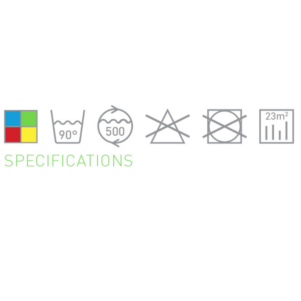 Πλένεται στους 90°C και έχει κύκλο ζωής τις 500 πλύσεις. Δεν χρησιμοποιείται με χλωρίνη και δεν μπαίνει στο στεγνωτήριο.